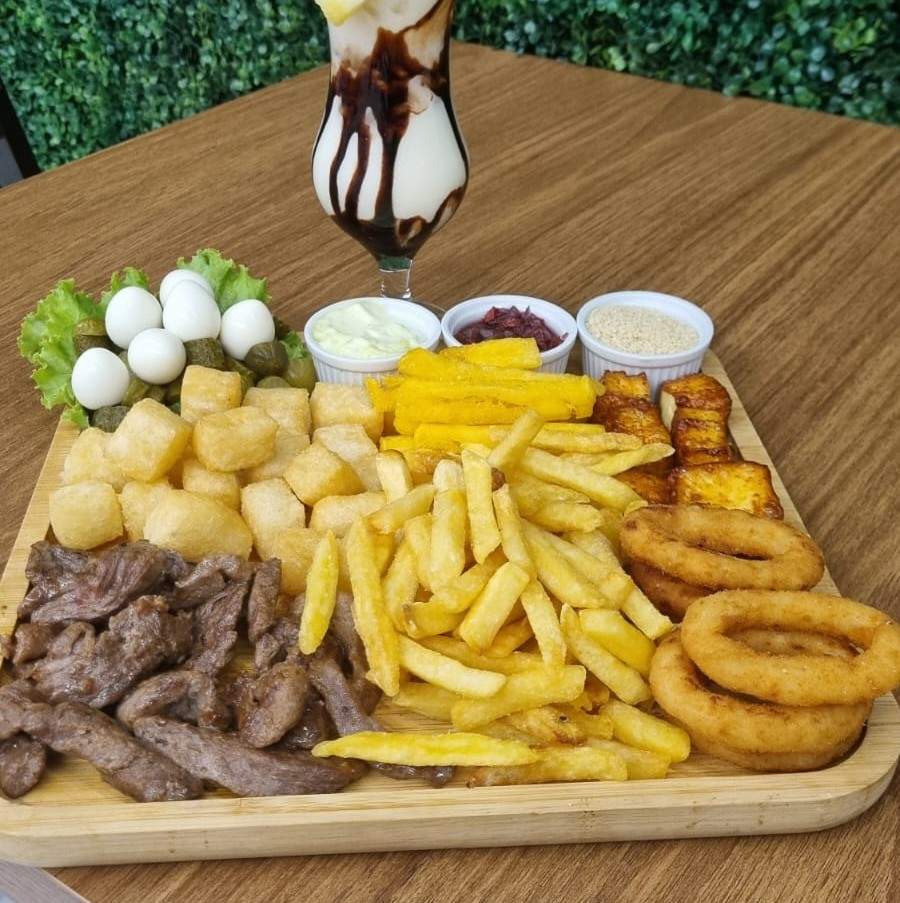 Carne de Gado na Chapa, Anéis de Cebola, Polenta Palito, Cubos de Mandioca, Queijo Coalho em Cubos, Batata Tradicional, Ovo de Codorna, Pepino. Acompanha Maionese Caseira e Farofa.