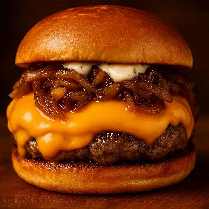 Pão Brioche, Blend Bovino de 180g, Queijo Prato ou Cheddar em Dobro, Cebola Caramelizada, Maionese.