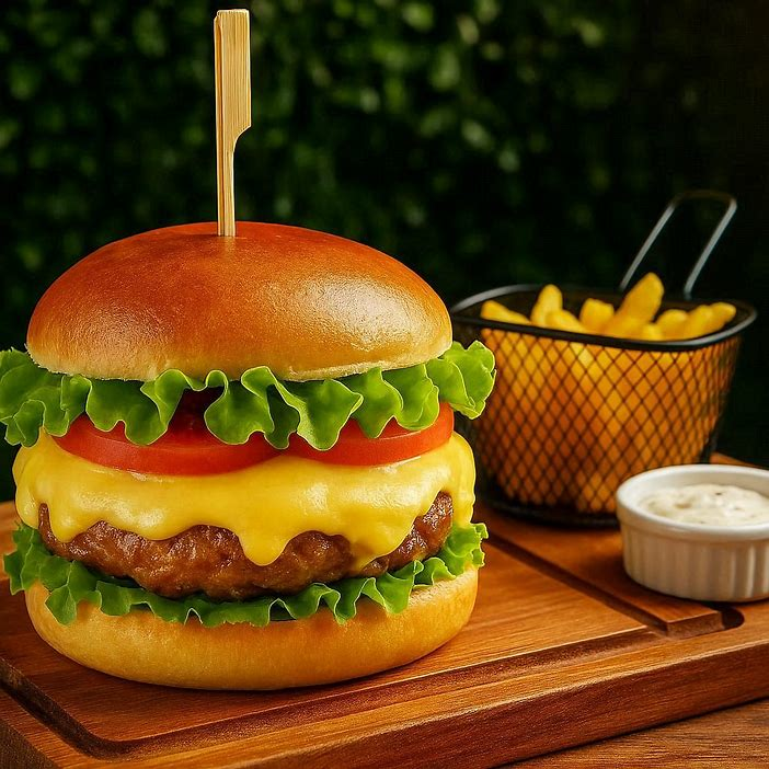 Pão Brioche, Blend Bovino de 180g, Queijo Prato ou Cheddar em Dobro, Queijo Crispy Frito, Maionese. Acompanha Batata Frita ou Anel de Cebola.