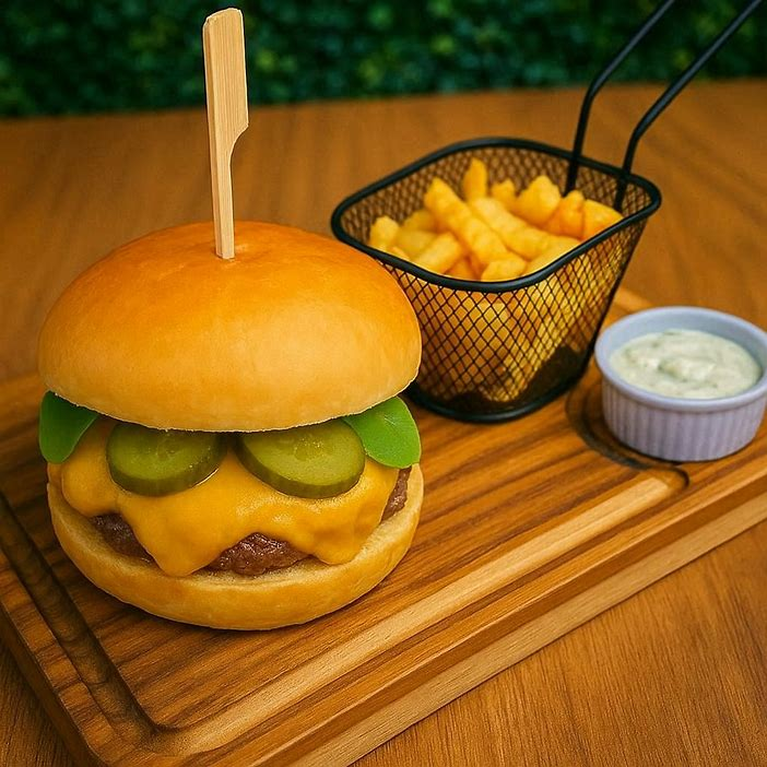 Pão Brioche, Blend Bovino de180g, Queijo Prato em Dobro, Picles, Rúcula, Maionese.