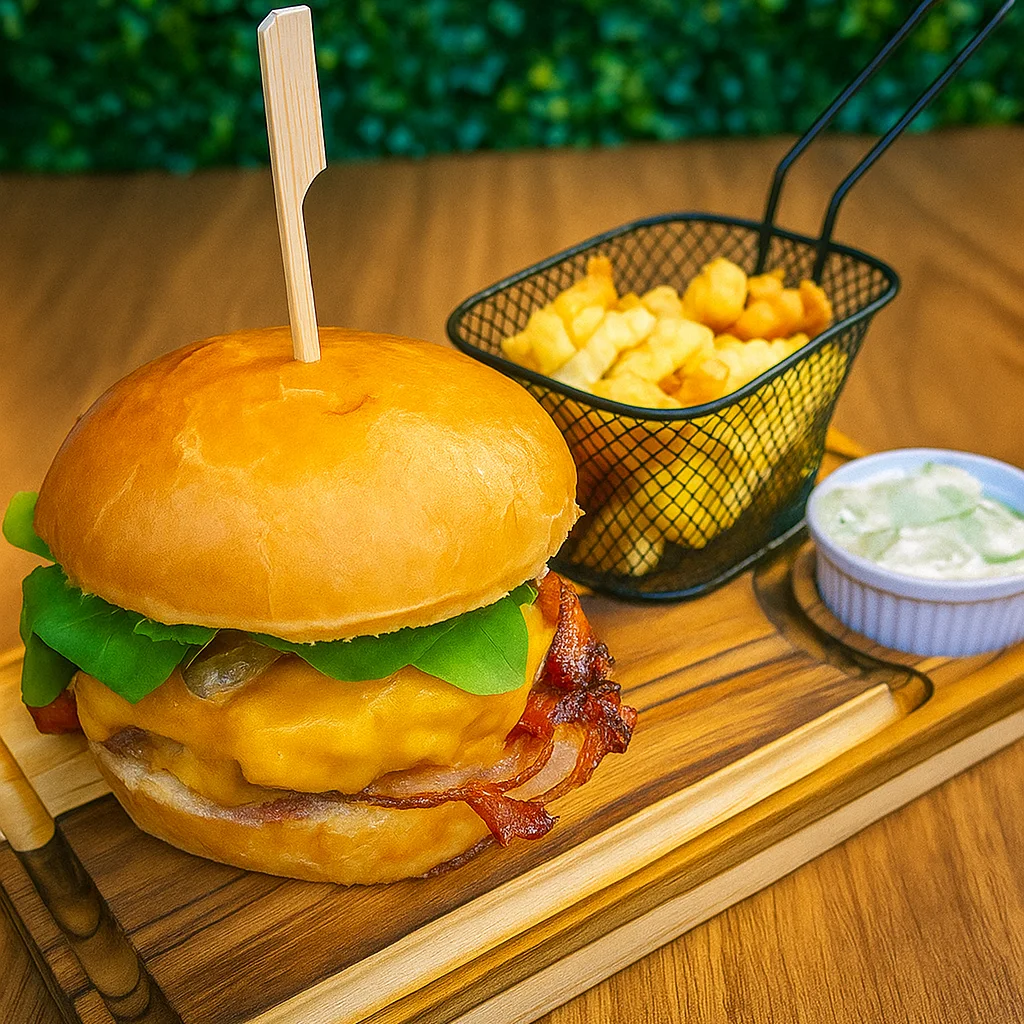 Pão Brioche, Blend Bovino de 180g, Queijo Prato ou Cheddar em Dobro, Queijo Crispy Frito, Maionese. Acompanha Batata Frita ou Anel de Cebola.