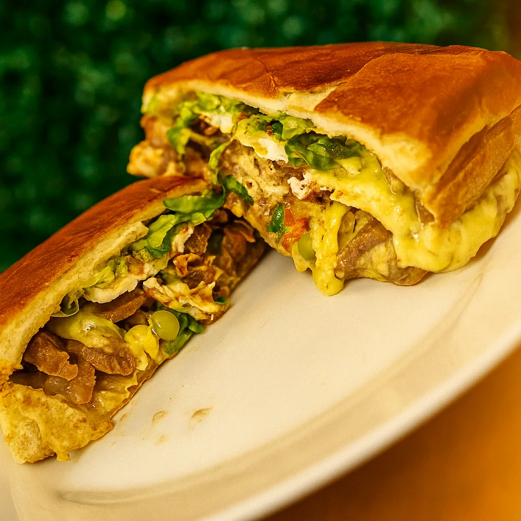 Filé Mignon, Queijo Muçarela, Ovo, Maionese Caseira, Ketchup, Ervilha, Milho, Tomate, Alface.