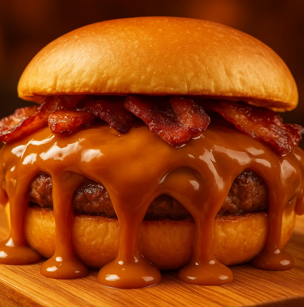 Pão Brioche, Blend Bovino de 180g, Queijo Provolone, Doce de Leite e Bacon em Cubos.