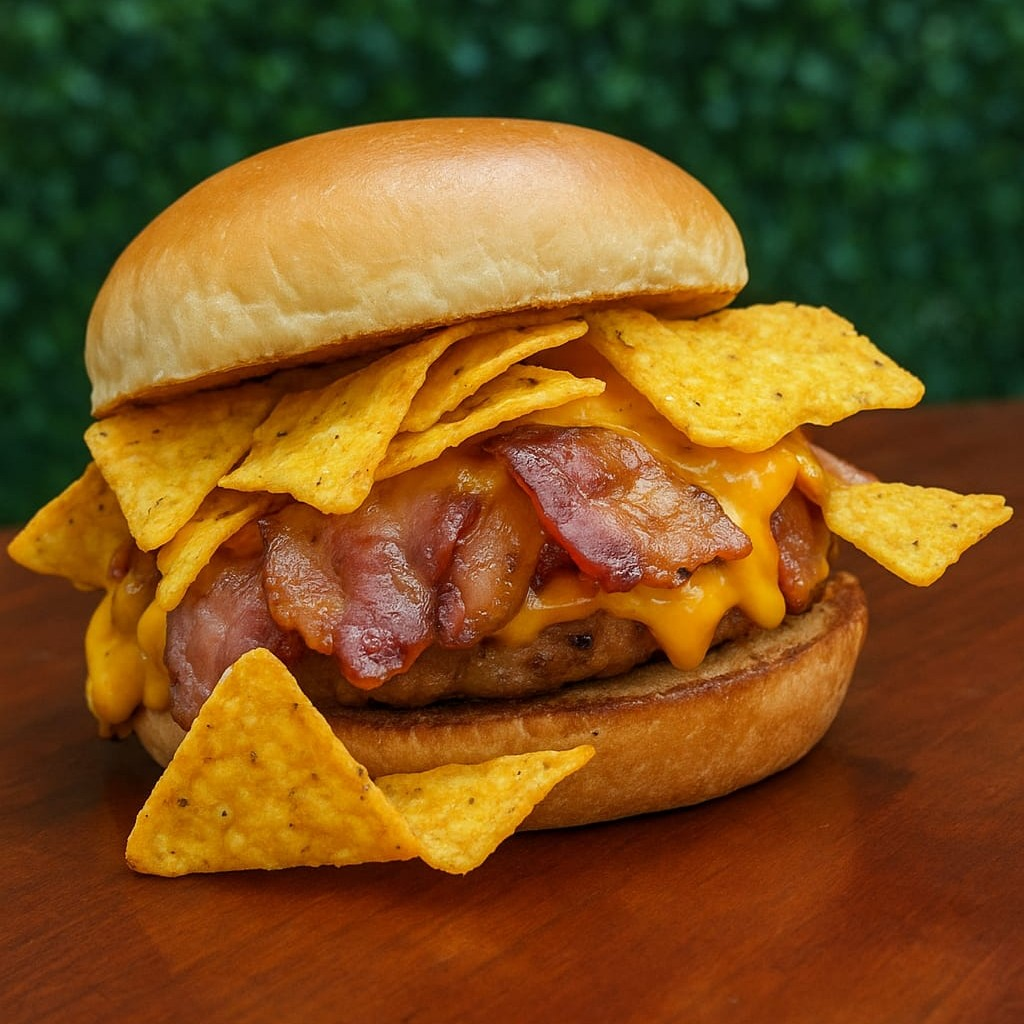 Pão Brioche, Blend Bovino de 180g, Bacon em Tiras, Queijo Cheddar ou Prato em Dobro, Doritos, Ketchup ou Maionese ou Barbecue.